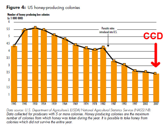 The report contained this figure, which I have modified to indicate the arrival of Colony Collapse Disorder: